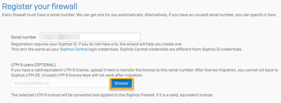 Klicken Sie unter UTM 9-Benutzer auf Durchsuchen, um die Sophos UTM-Lizenzdatei hochzuladen.