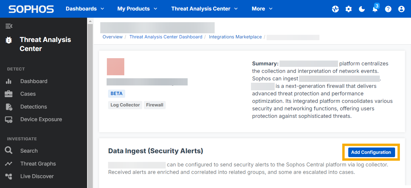 - Gehen Sie in Sophos Central zu Bedrohungsanalyse-Center > Integrationen > Konfiguriert.