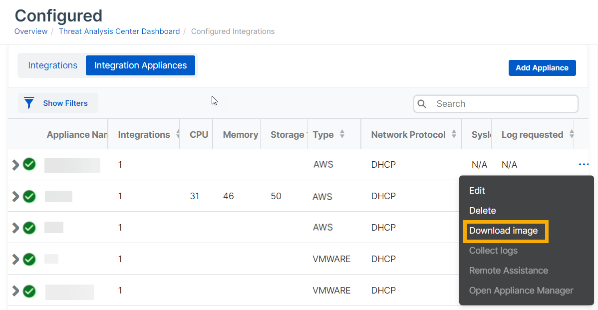 - Wählen Sie den Tab Integrations-Appliances aus und suchen Sie Ihre Appliance.