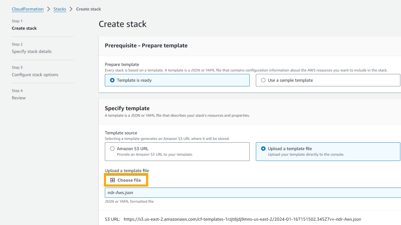 Gehen Sie auf der Seite Create stack wie folgt vor: