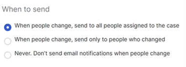 Die Standardeinstellungen für den Bereich Wann senden lautet Standardeinstellung Wenn sich Personen ändern, an alle dem Fall zugewiesenen Personen senden. Wir senden E-Mails an alle zugewiesenen Administratoren, einschließlich der neu zugewiesenen oder entfernten Administratoren. Wir senden auch eine E-Mail an den Administrator, der die Änderung vorgenommen hat.