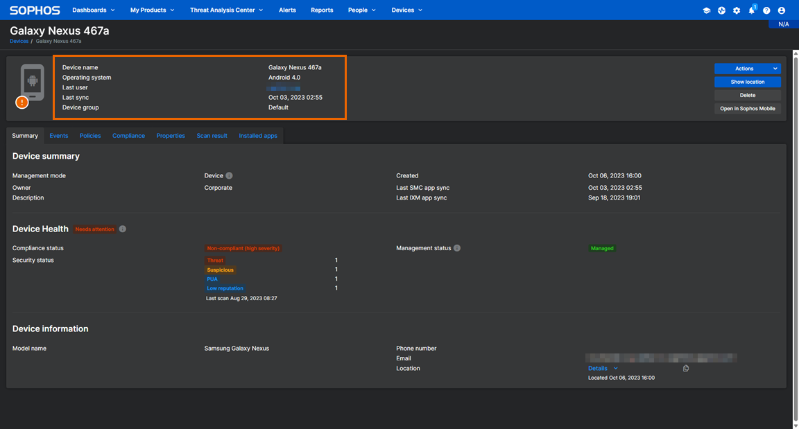 In Sophos Mobile öffnen: Öffnen Sie die Seite Gerät anzeigen des Geräts in Sophos Mobile. Auf dieser Seite finden Sie noch mehr Informationen und Aktionen für das Gerät als auf der Detailseite des Geräts in Sophos Central. Siehe Die Seite „Gerät anzeigen“.