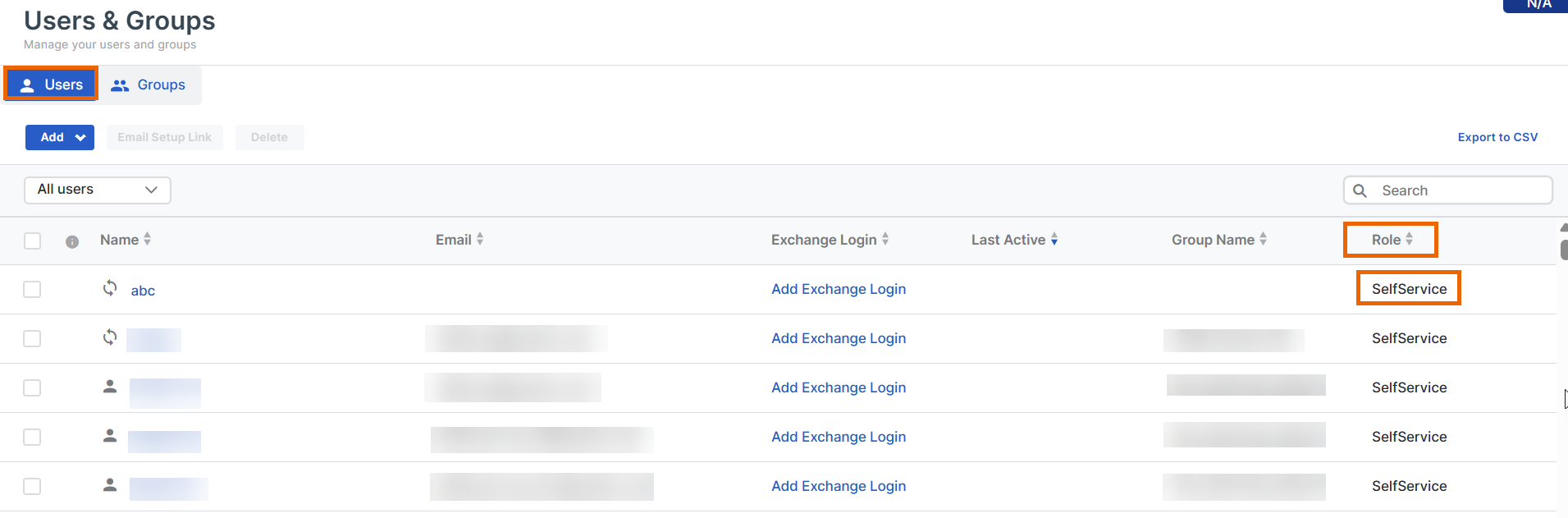 In der Spalte „Rolle“ muss „SelfService“ angezeigt werden.