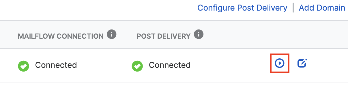 If you have successfully set up Sophos Mailflow for a domain, the domain will display a green tick with a Connected status under Mailflow Connection. Similarly, for post-delivery protection connection, the status will be a green tick with a Connected status in the Post Delivery column.
