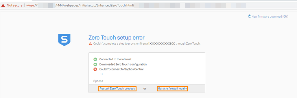 You can click one of the following options: Restart Zero Touch process or Manage firewall locally.