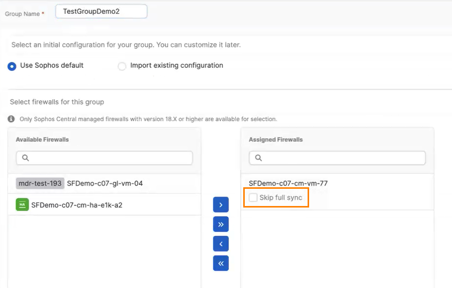 If you skip full sync, this may cause a configuration mismatch between Sophos Central and the firewall. The firewall won't synchronize with the other firewalls in the group, which means Sophos Central won't push existing configurations to the firewall.