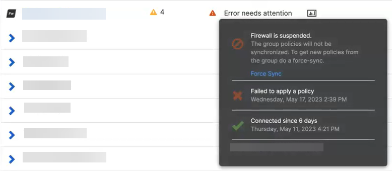 If a grouped firewall is suspended but connected to Sophos Central, you can force it to resynchronize. To do this, in Sophos Central, go to My Products > Firewall Management > Firewalls, click the arrow next to the firewall group list, and click the alert in the Sync & Management column.