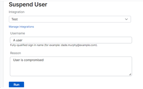Our example shows how to use a response action to suspend a compromised user. To take action, do as follows: