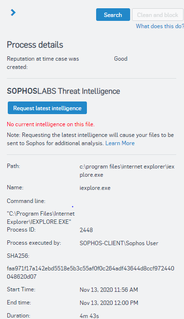 These include the global reputation of the file, path, name, command line, process ID, executing user, SHA256, start and end time, and duration. The following screenshot shows the details of a process associated with Internet Explorer 11: