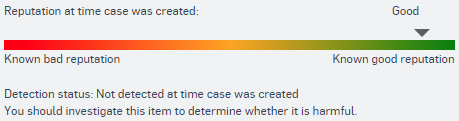 The reputation score shows the trustworthiness of the file. Sophos scores the reputation on a scale from red (bad) to green (good). Known clean files are shown in the green range of the scale and known malicious files are shown in the red range.