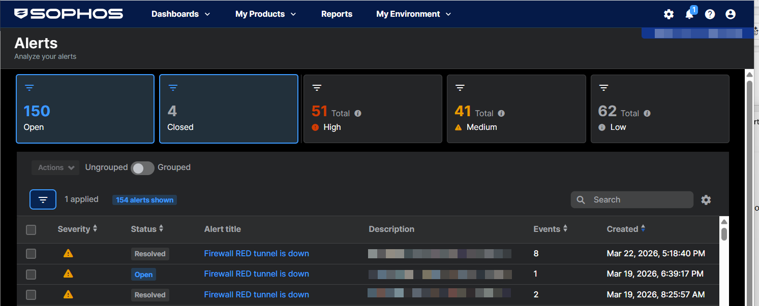 Sophos Central automatically collates some repeated events and shows them as a single alert. For example, if a firewall VPN tunnel goes down and is later restored, both events are included in one alert.