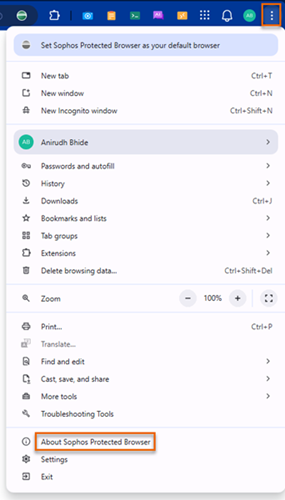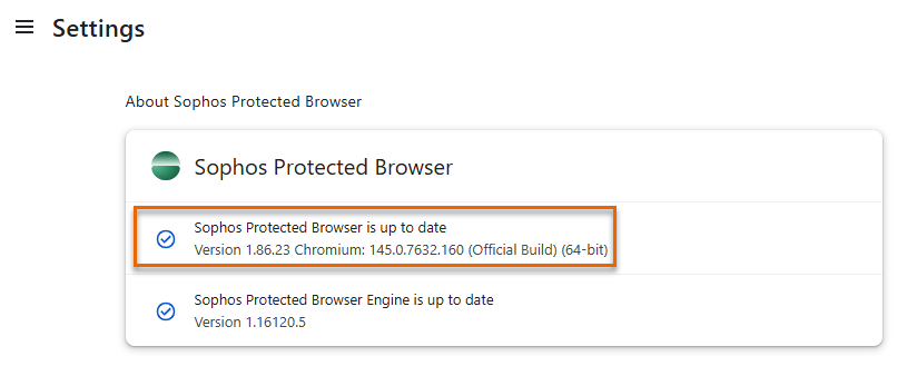 and select About Sophos Protected Browser.About Sophos Protected Browser shows your current Protected Browser version and whether it's up to date. The version information is determined using the following logic: