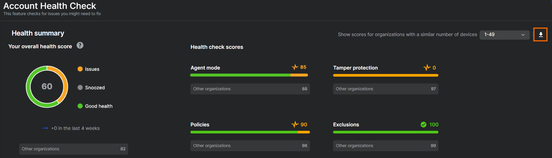 You can export a snapshot of your Account Health Check dashboard to a PDF and use it as a report.
