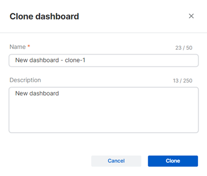 In the Clone dashboard dialog, enter a Name and Description, and click Clone.