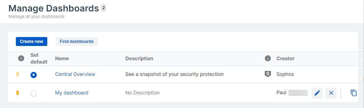 The Manage Dashboards page lets you view and manage your Sophos and custom dashboards.