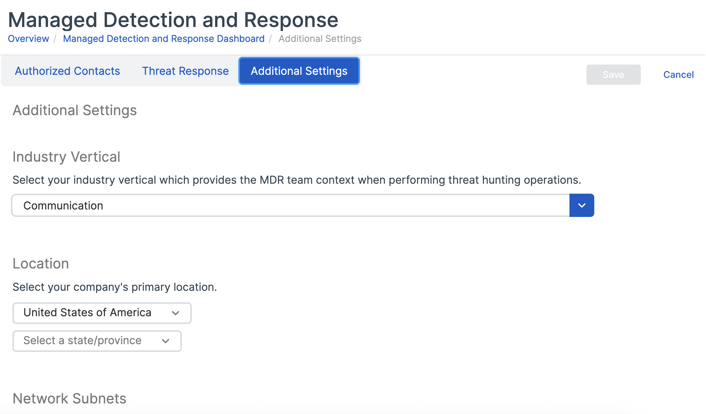 You must set at least one authorized contact in your organization before you can configure any other MDR settings or use the service. See Set authorized contacts.
