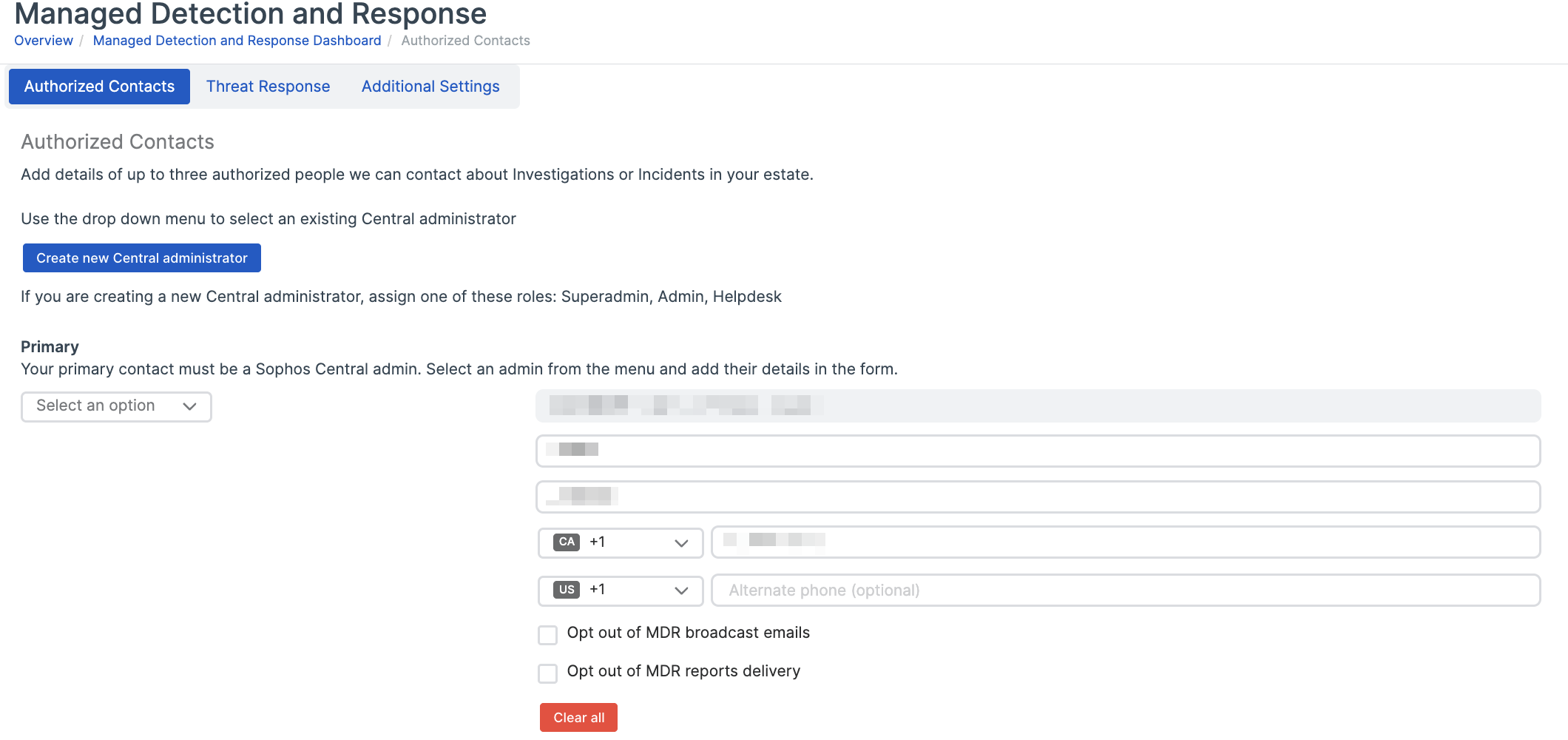 Enter contact details for Sophos Central administrators who will get MDR notifications and work with the MDR team. If there's an active threat, we'll contact each of them in turn until we get a response.