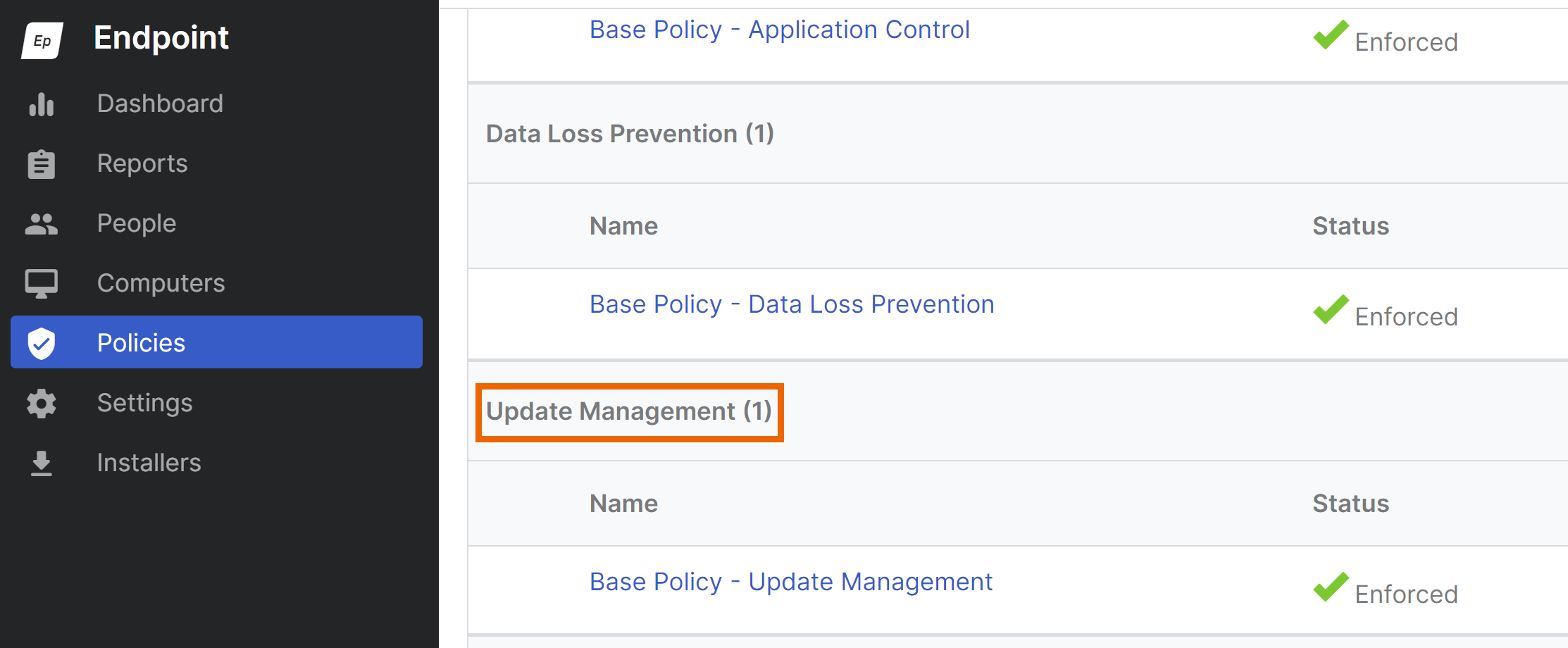 3. Select the Update management policy that applies to the devices you want to protect with the package. Click the policy to edit it.