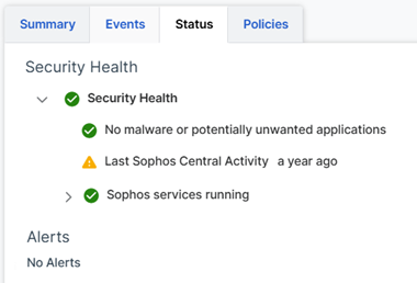 The Status tab in a computer's details page lets you see the computer's security health and details of any alerts.