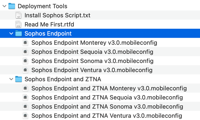 The extracted Deployment Tools folder contains the Sophos Endpoint and Sophos Endpoint and ZTNA folders. Each folder contains configuration files for each macOS version.