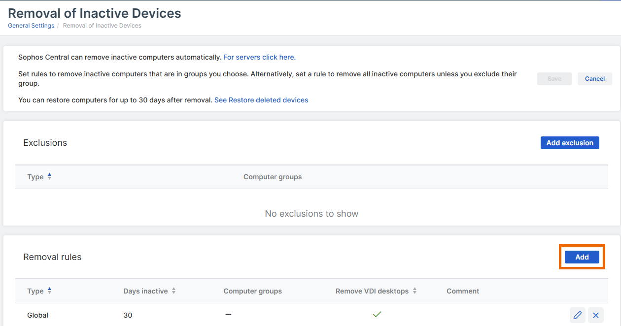 Puede configurar Sophos Central para que elimine los dispositivos automáticamente si han estado inactivos durante un periodo de tiempo determinado.