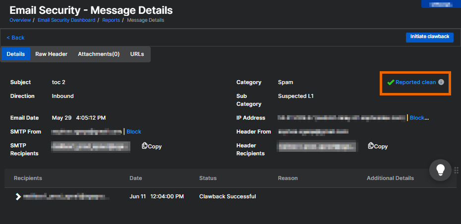 Cuando se ha enviado un mensaje a SophosLabs desde Detalles del mensaje, se etiqueta como Notificado como amenaza o Notificado como limpio. Puede pulsar el enlace para abrir el Informe de análisis de SophosLabs. El informe se filtra automáticamente para mostrar el mensaje seleccionado.