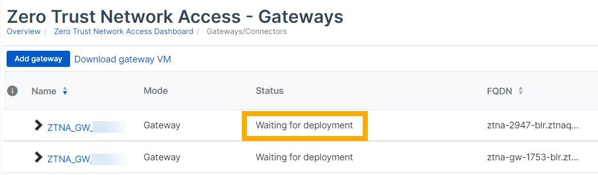 En la página Puertas de enlace, el estado de la nueva puerta de enlace es Esperando despliegue. Haga clic en la puerta de enlace para ver los detalles.