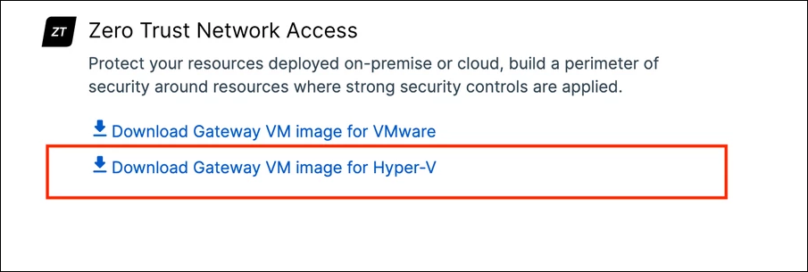 En Zero Trust Network Access, haga clic en Descargar imagen de equipo virtual de puerta de enlace para Hyper-V.