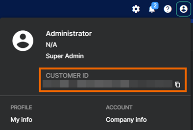 ページ右上のお客様のプロファイルアイコン プロファイルアイコン。 をクリックします。お客様の顧客 ID は、アカウント名の下に表示され、コピー アイコン コピーアイコン。 をクリックしてコピーすることができます。