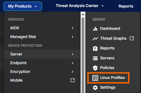 Linux のプロファイルは、Linux デバイスによって使用される検出ルールのセットであり、Native Cloud Security の下にはありません。「マイプロダクト > Server > Linux プロファイル」の順に選択します。