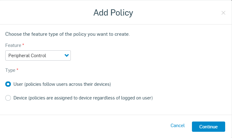 - 「種類」を選択します。この例では「ユーザー」ポリシーが選択されています。これは、使用しているデバイスに関係なく、ユーザーに適用されます。
