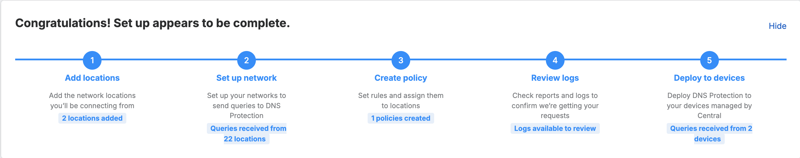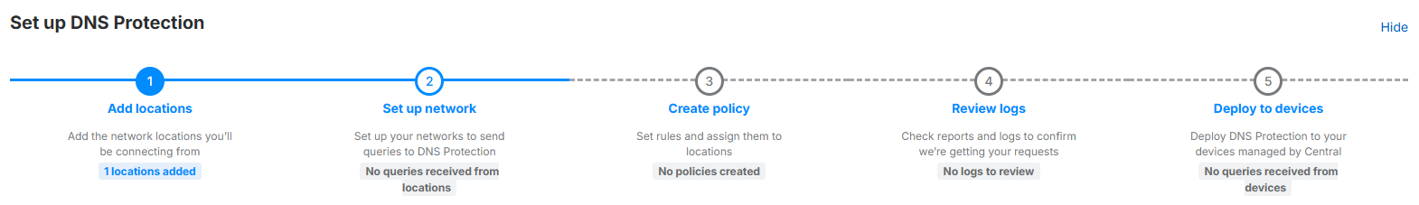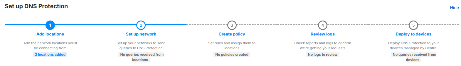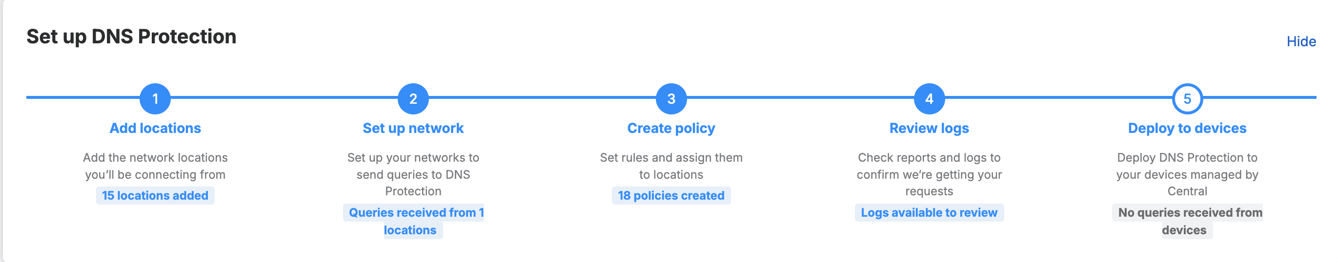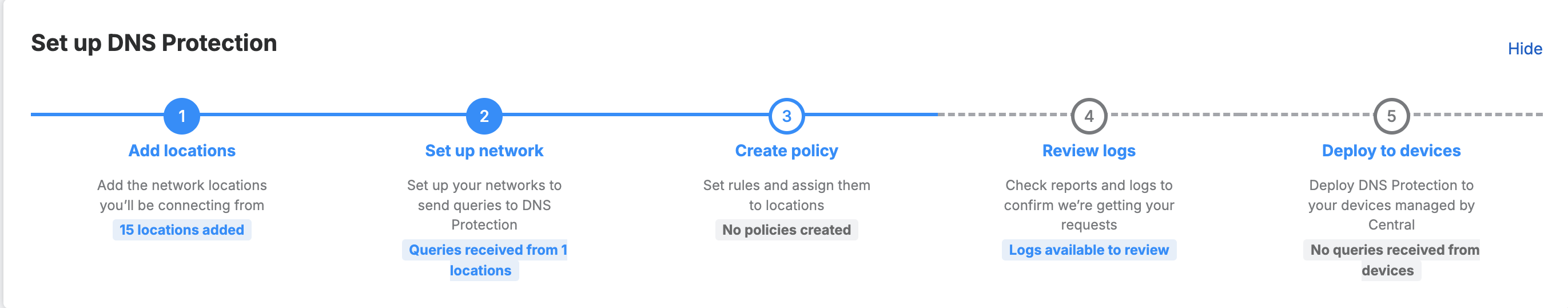 DNS Protection の設定」アシスタントは、DNS Protection を使用するための初期手順を設定するのに役立ちます。アシスタントの進行に合わせて、各ステップの状態が表示されます。