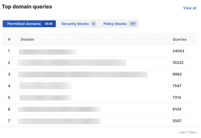 • 許可されたドメイン:許可されたドメインに対して提供された DNS リクエストの数を表示します。「すべて表示」をクリックして、「送信元別の DNS の使用状況」テンプレートから生成されたレポートを表示します。