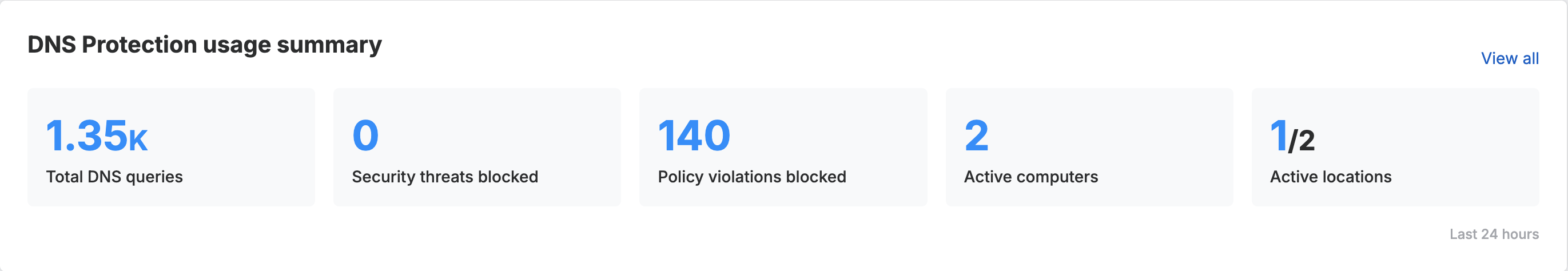 • ポリシーのブロック:ポリシーによってブロックされた DNS リクエストの数を表示します。「すべて表示」をクリックして、「送信元別の DNS の使用状況」テンプレートから生成されたレポートを表示します。