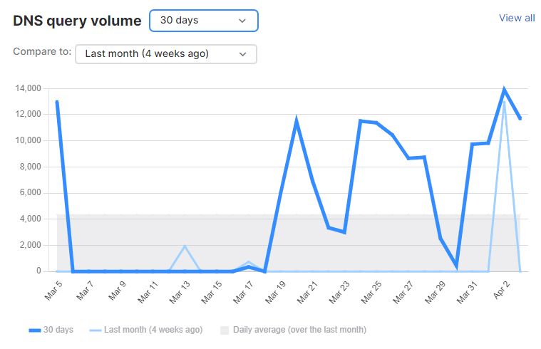 このグラフは、時間経過に伴う DNS クエリーの数を示しています。過去 3時間24時間、または 30日間のトラフィックを表示できます。トラフィックを先週または先月の(4週前) と比較できます。24時間、または 30日間を選択すると、先月の1日平均が表示されます。