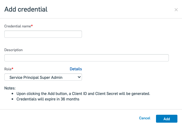 - 「認証情報の追加」をクリックして、認証情報に名前と説明を付けます。