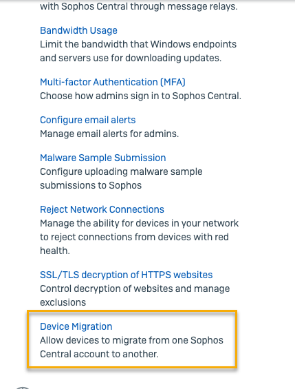 - 該当する Sophos Central アカウントに対してデバイスの移行をオンにします。詳細は、デバイス移行をオンにするを参照してください。