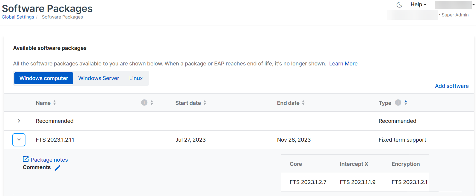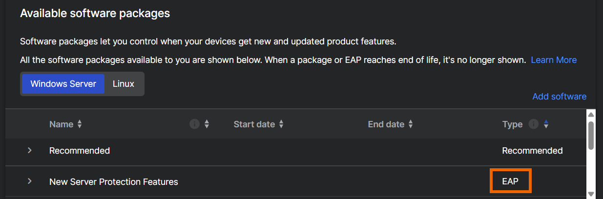 • EAP: このパッケージはアーリー アクセス プログラム用で、ソフォスがすべてのお客様にリリースする前に、新機能を試用できます。EAP 内のデバイスは、EAP が終了するか、デバイスが EAP から削除されるまで、割り当てられている他のソフトウェアパッケージを無視します。