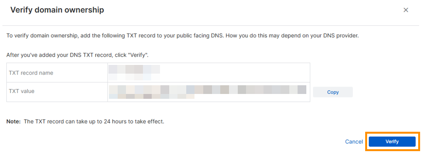 TXT レコードを DNS にコピーし、伝達が完了するのを待機します。