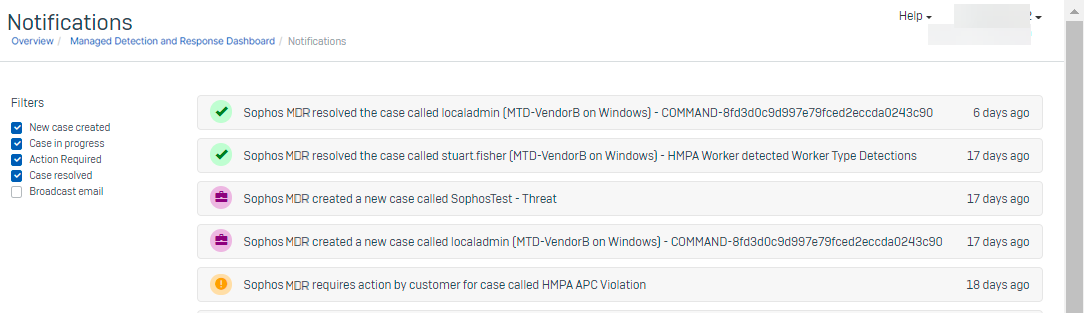 通知ページを表示するには、「マイプロダクト > MDR > 通知」に移動します。このリストには、担当者に送信された通知すべてが表示され、次のイベントが含まれます。