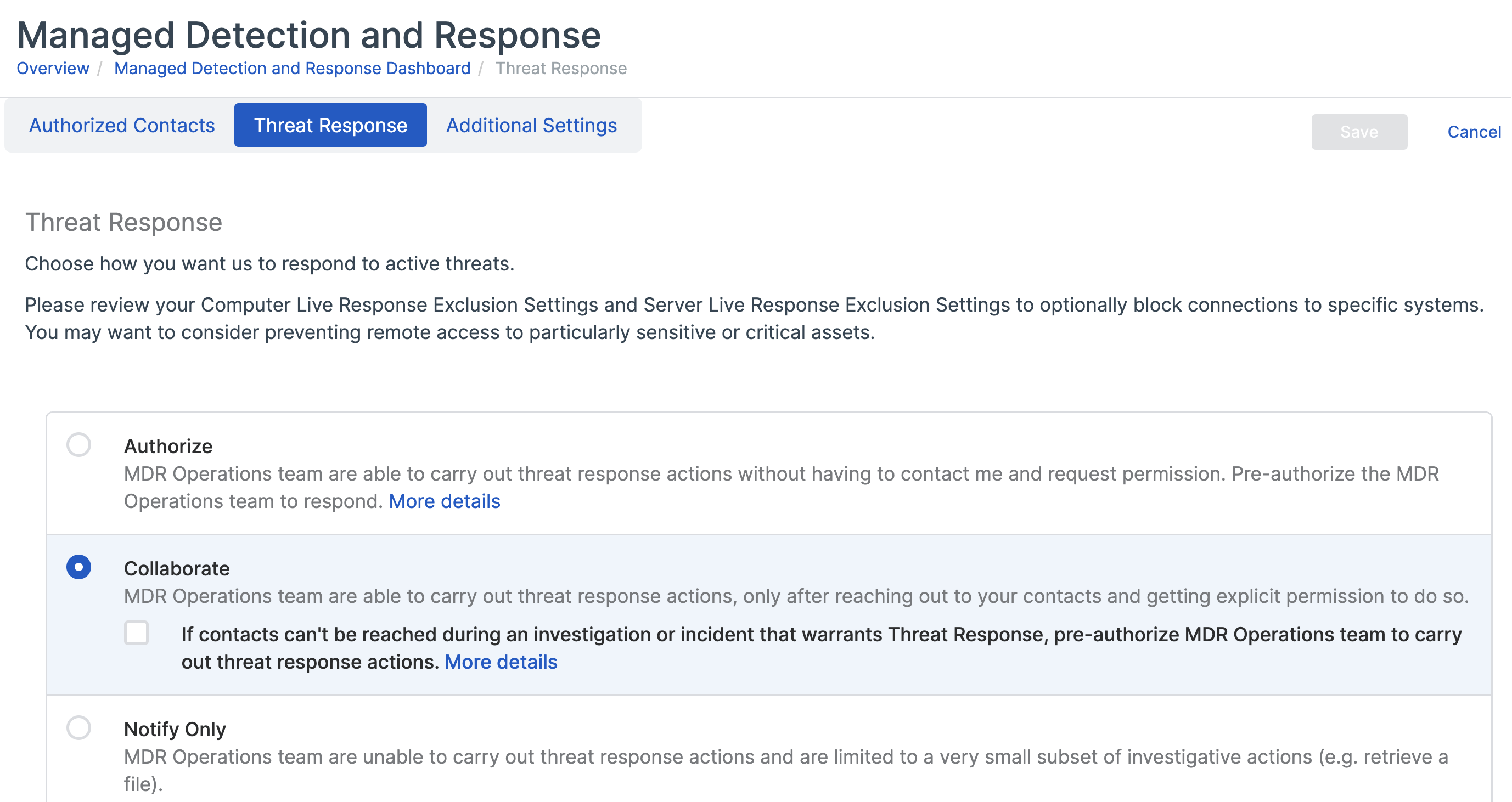 MDR 運用チームがインシデントに対応できるように、「承認」または「共同対処」の脅威への対応を選択することを強くお勧めします。詳細は、脅威対応の設定を参照してください 。