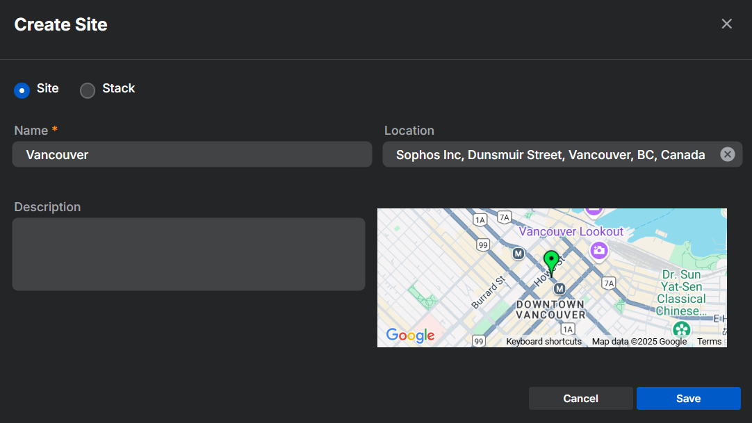 - 別のサイト/スタックの追加:「サイト/スタックの作成」をクリックして、サイトまたはスタックを作成します。詳細は、サイトとスタックの追加を参照してください。
