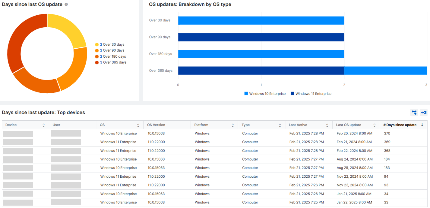 • 前回の OS 更新からの日数: このグラフは、デバイスが最後に更新されてからの日数で分類されます。