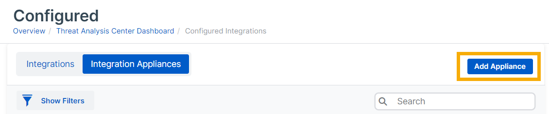 - 「脅威解析センタ- > 統合 > 設定済み」の順に選択して、「統合アプライアンス」タブを選択します。
