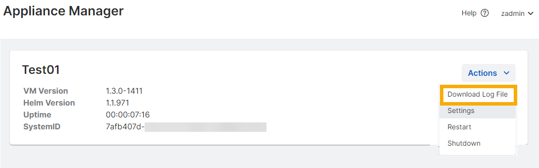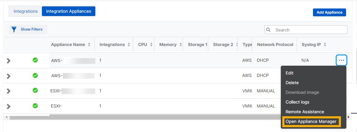 アプライアンスを見つけます。右端の列で、省略記号 (3つの点) をクリックし、「ログの収集」を選択します。