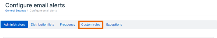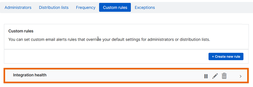 統合の正常性の警告に関するメール通知を受信する管理者を指定できます。これを行うには、カスタムルールを設定する必要があります。