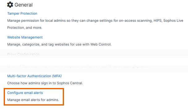 Sophos Central で統合の正常性の警告を受信した場合は、その警告に関するメール通知を管理者に送信する頻度を変更できます。