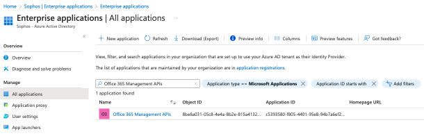 Sophos Central の「統合 > Microsoft - Office 365 管理アクティビティ」で、新しい統合が表示されます。