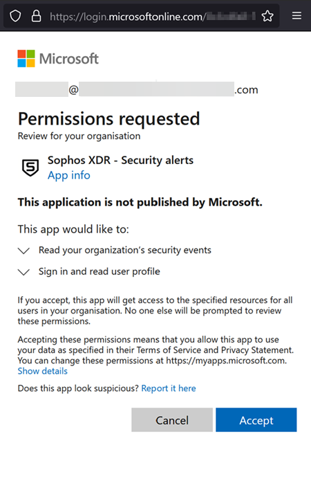 8. アプリにパーミッションを許可するように求められます。これらのパーミッションによって、Sophos Central と統合する Microsoft アプリを作成できます。「同意する」をクリックします。
