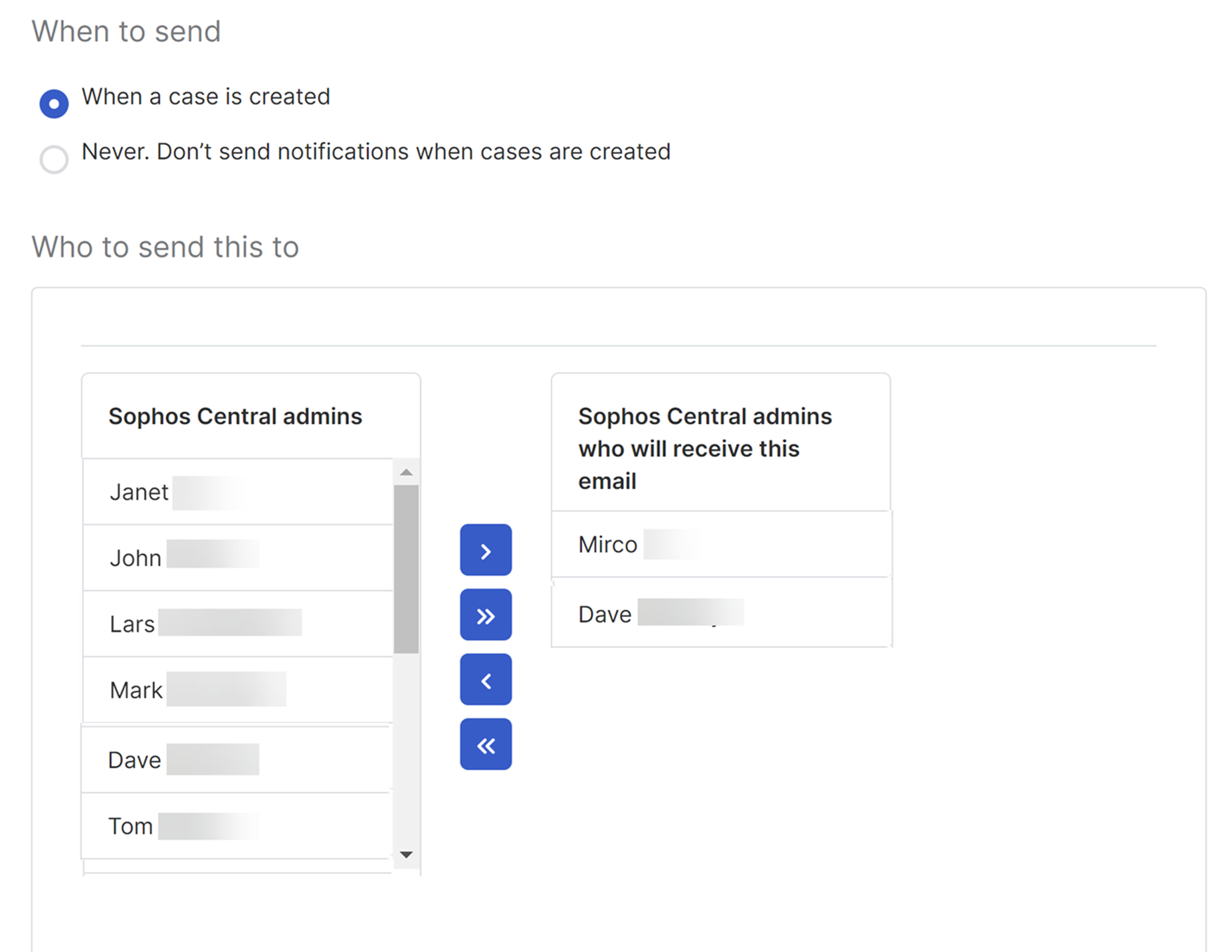 「送信するタイミング」のデフォルトは、「担当者の変更時に、これまでケースに割り当てられた担当者すべてに送信する」です。新しく割り当てられた、または削除された管理者を含む、割り当てられたすべての管理者にメールを送信します。また、変更を行った管理者にメールを送信します。